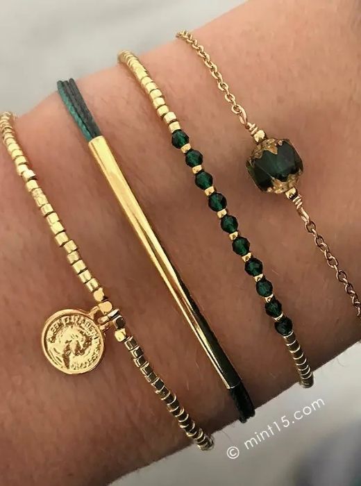 Prachtige armbandenset met geselecteerde armbanden met goud en groene afwerkingen. Het perfecte cadeau, geschikt voor de meeste polsmaten.